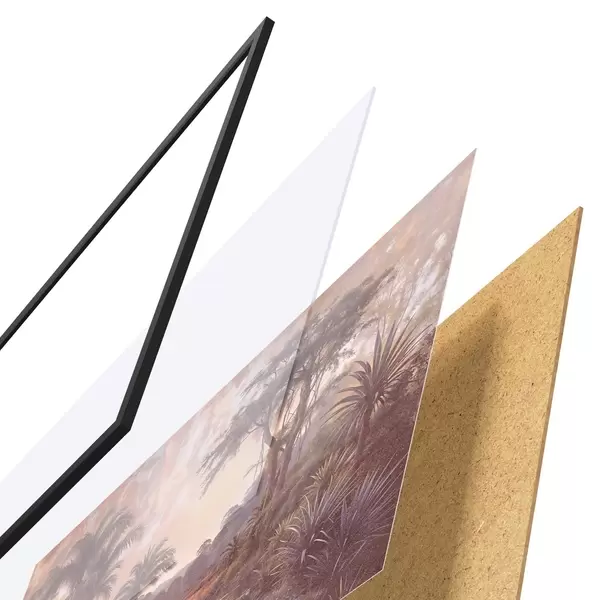 El póster consta de marco, plexiglás, imagen impresa y soporte de aglomerado. El póster puede colgarse inmediatamente en la pared gracias a los soportes de la parte posterior.