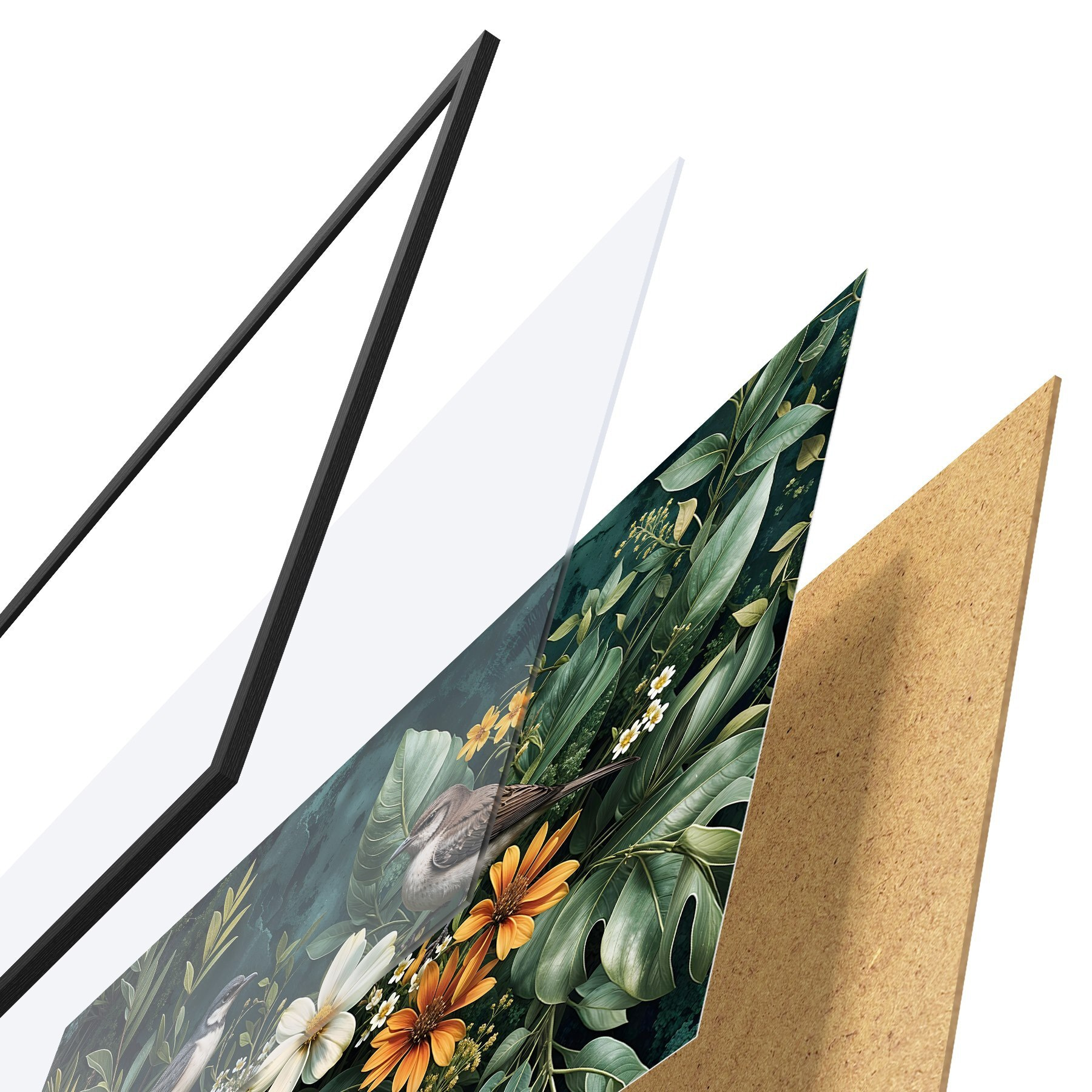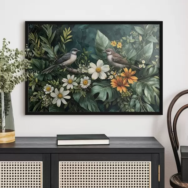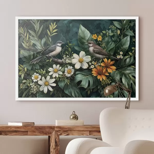 Poster Pequeños pájaros posados en ramas rodeadas de exuberante follaje tropical , incluyendo grandes hojas verdes y flores de colores f42220