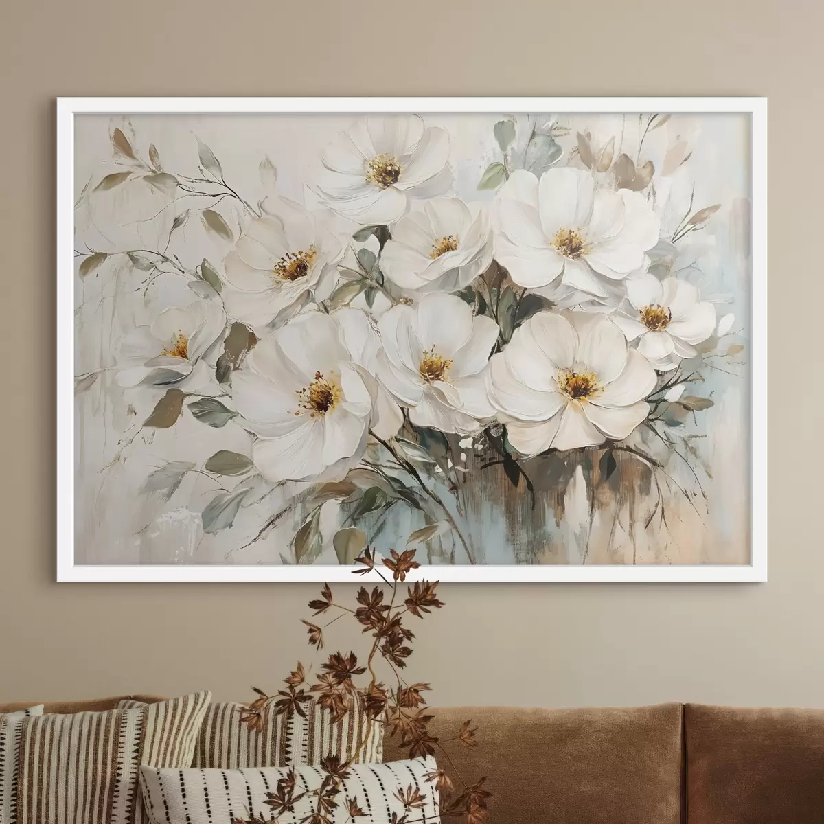 Poster Ramo de grandes flores blancas al óleo con centros amarillos sobre fondo claro f42222