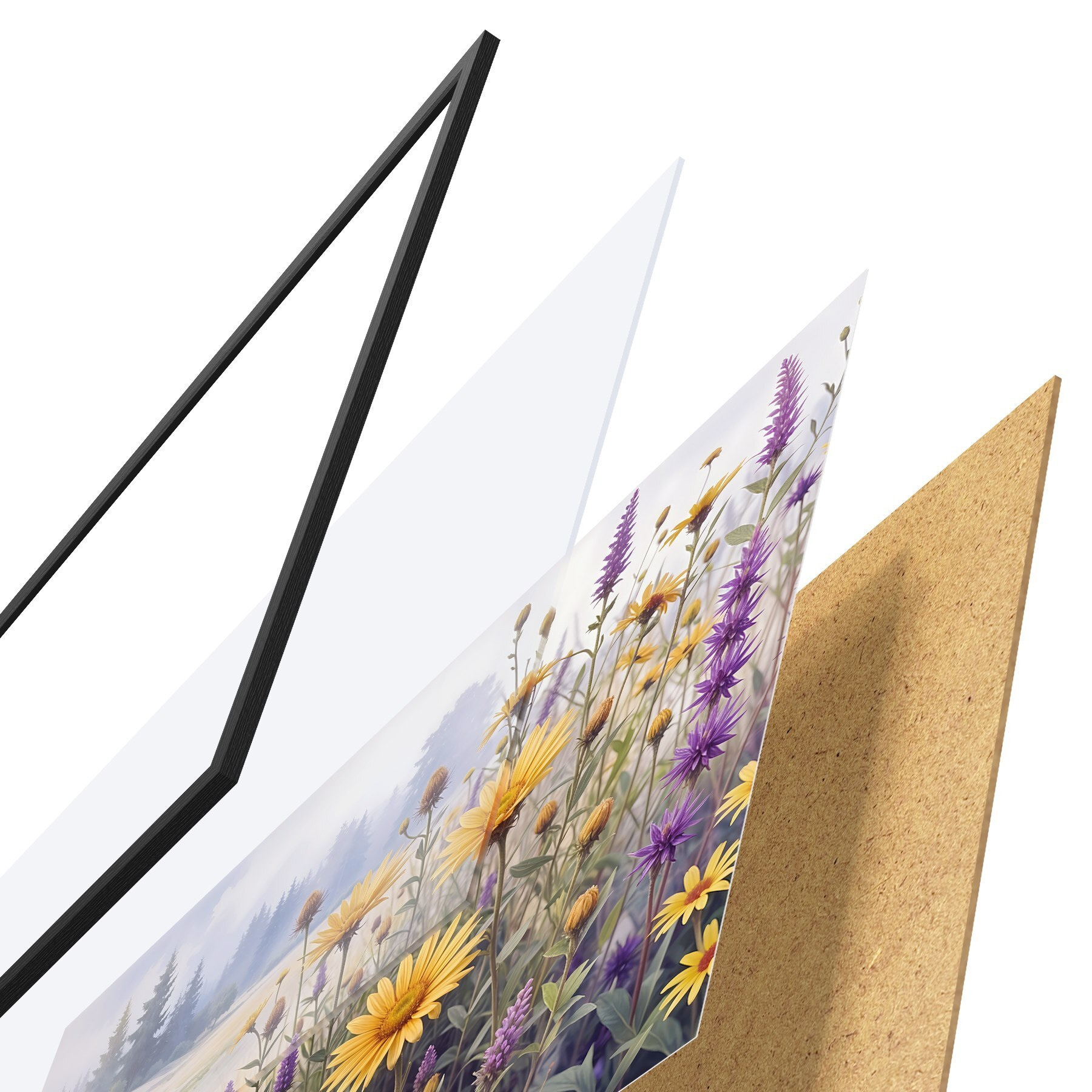Poster Un campo de girasoles amarillos y flores silvestres púrpuras en un paisaje forestal brumoso con pinos al fondo f42223