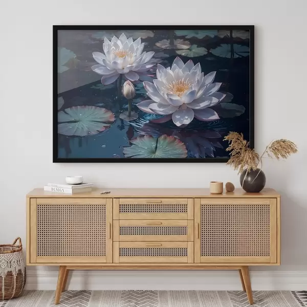 Poster Flores de loto blancas flotando en un estanque tranquilo con nenúfares f42225