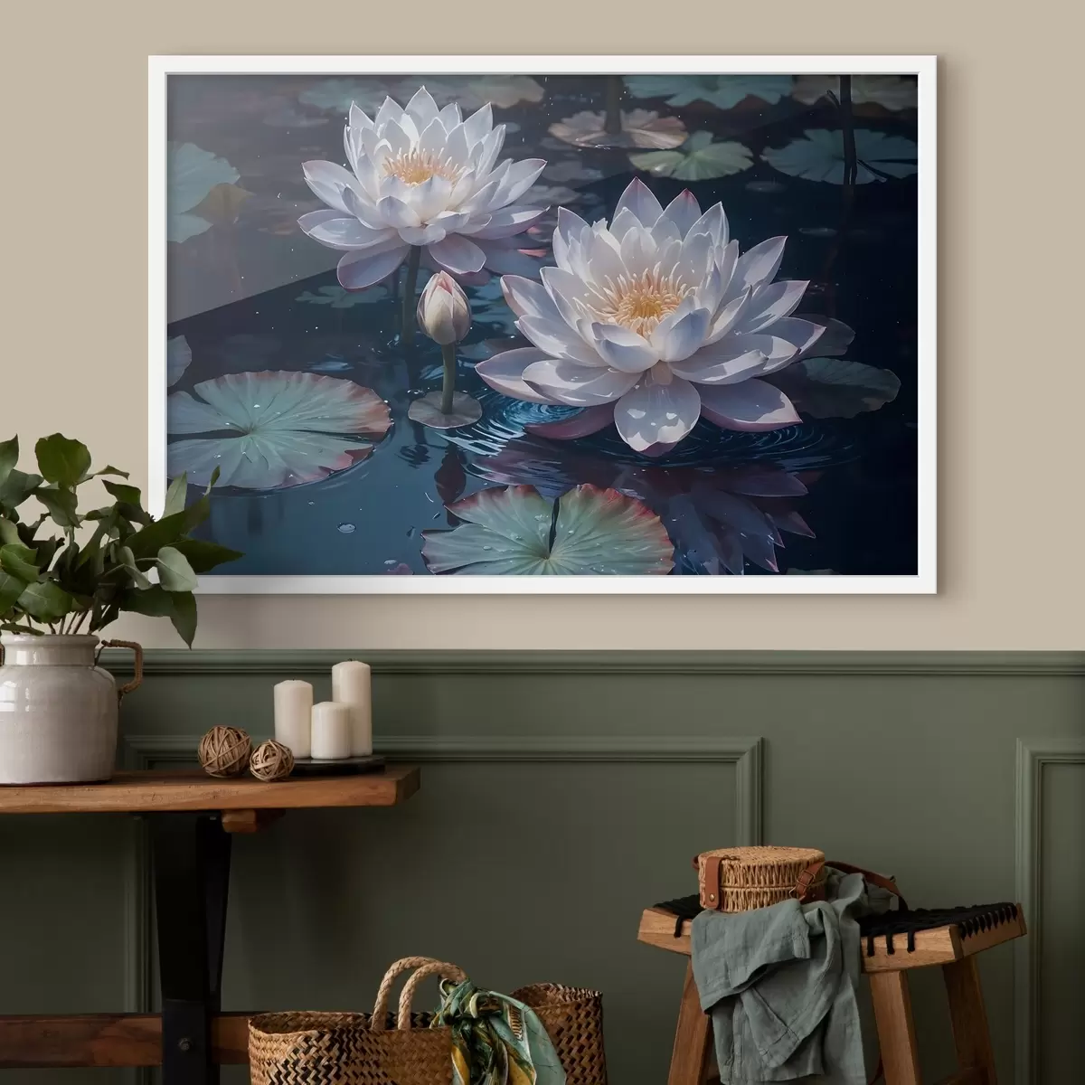 Poster Flores de loto blancas flotando en un estanque tranquilo con nenúfares Nr f42225