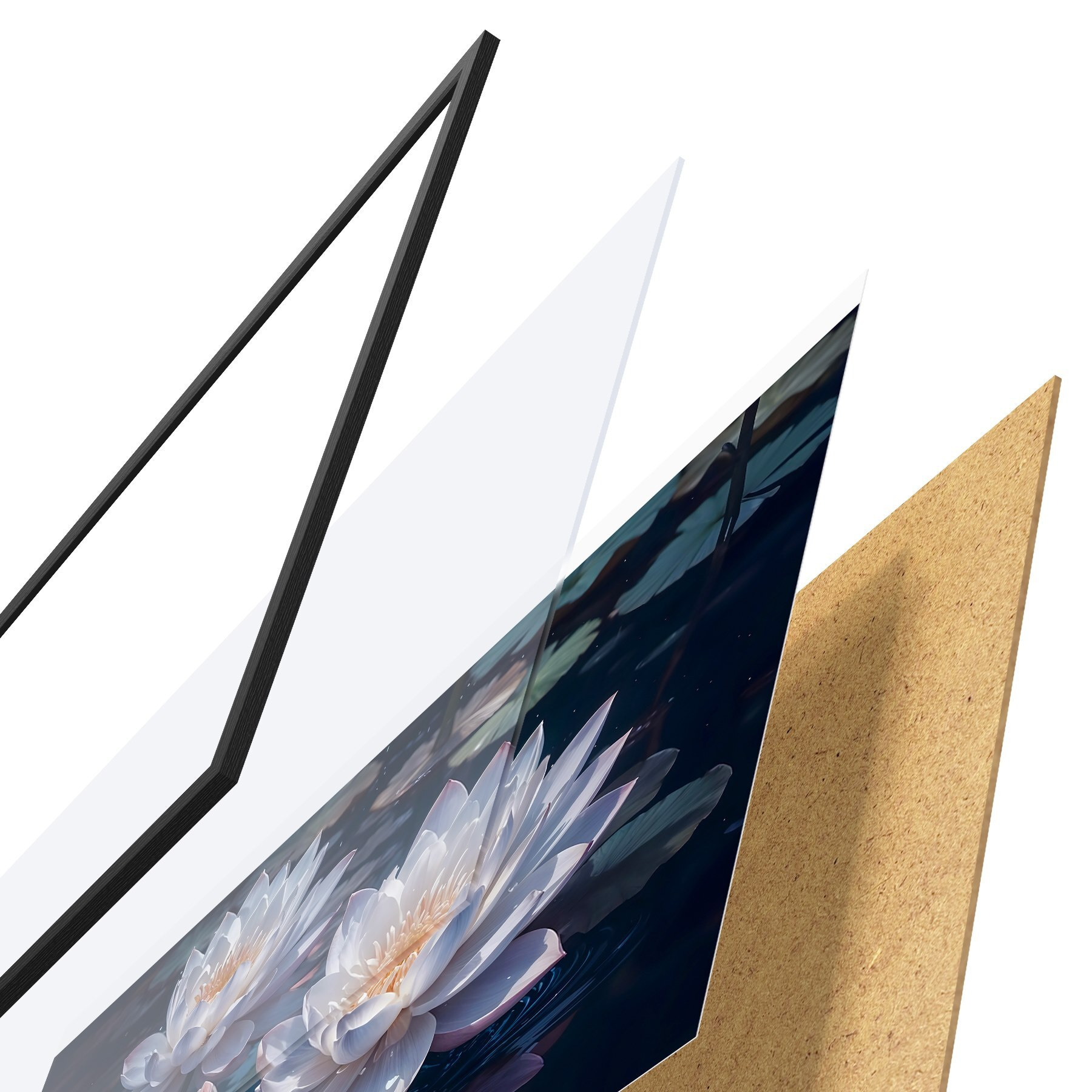 El póster consta de marco, plexiglás, imagen impresa y soporte de aglomerado. El póster puede colgarse inmediatamente en la pared gracias a los soportes de la parte posterior.