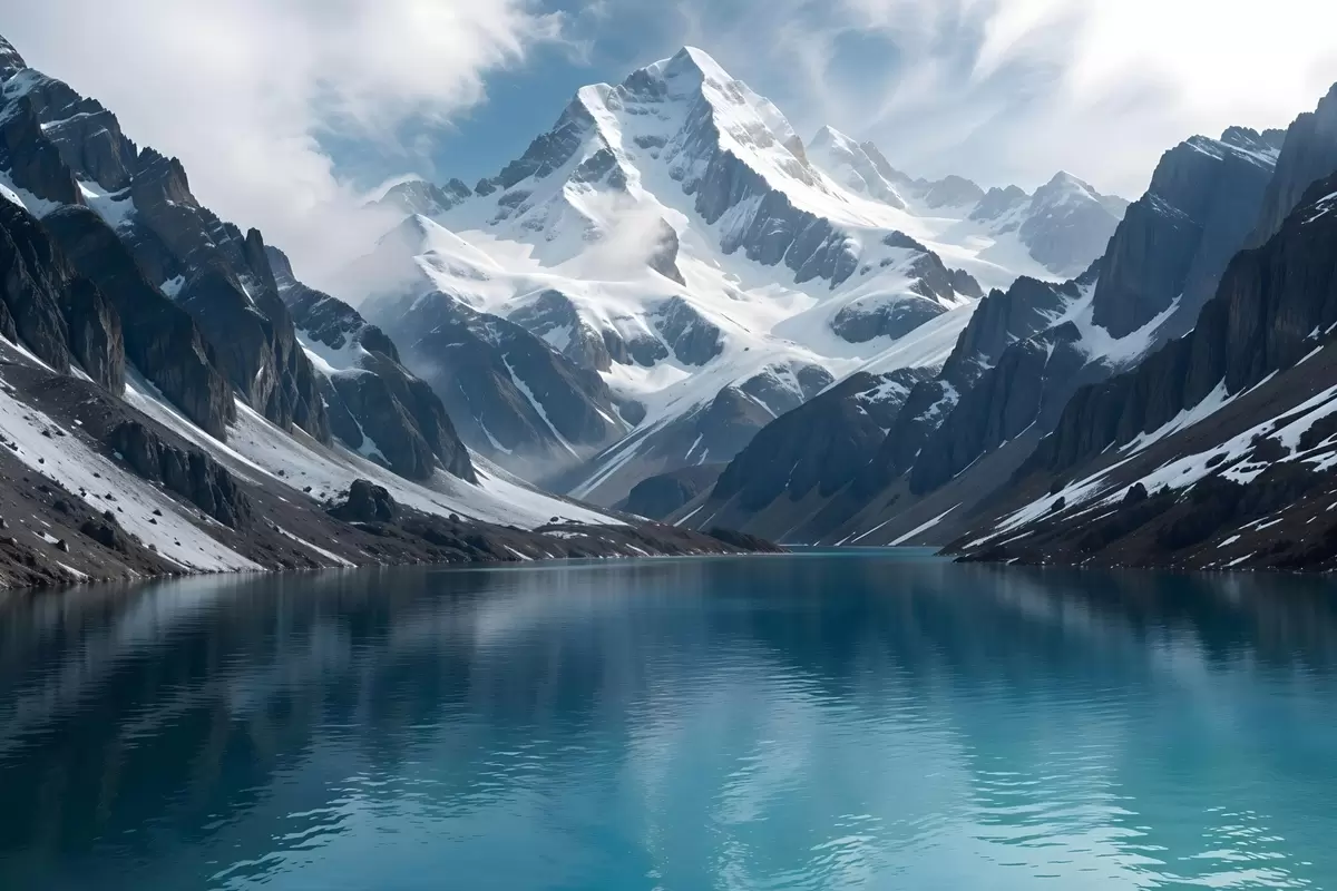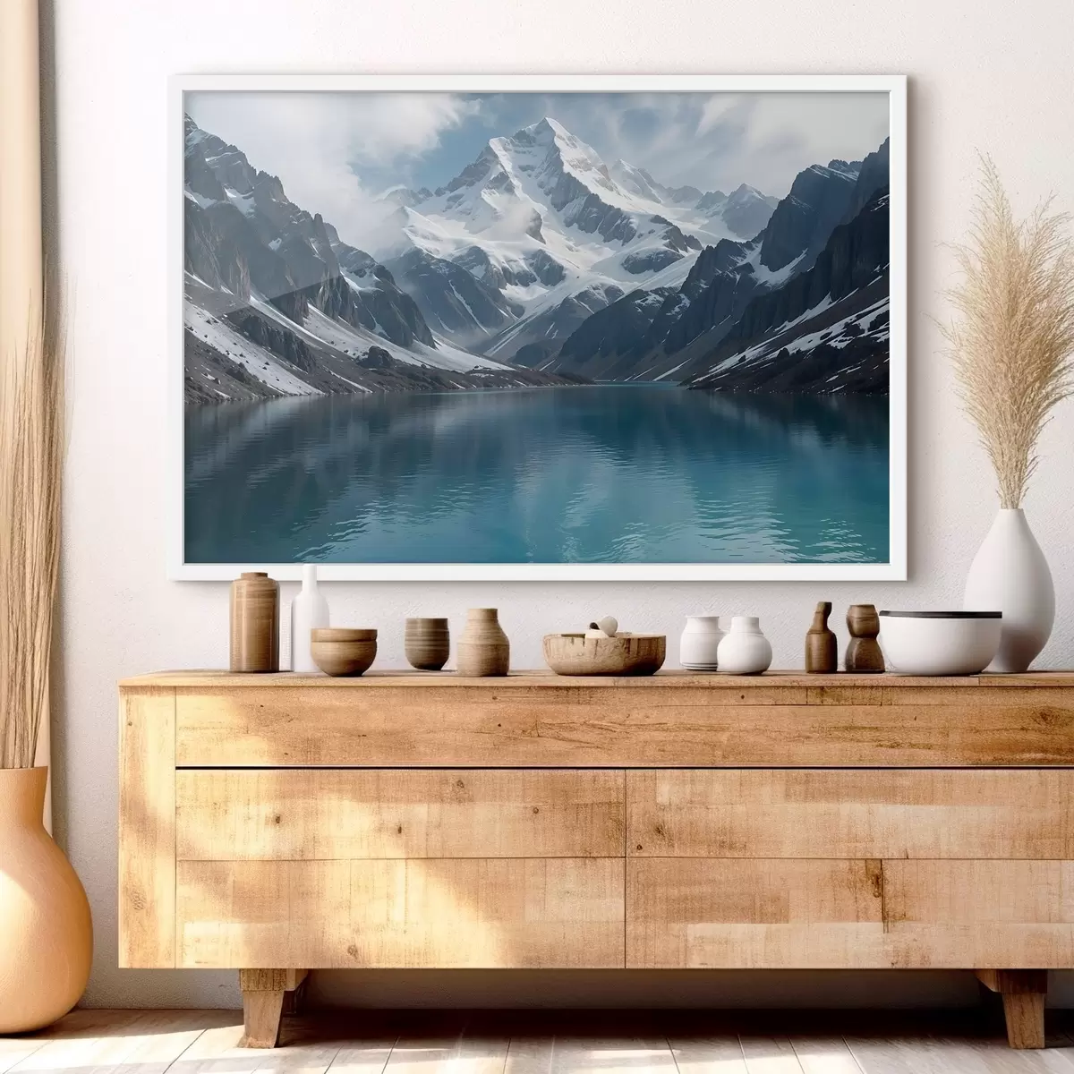 Poster Un pico de montaña nevado reflejado en un sereno lago turquesa, rodeado de terreno rocoso y dramáticas nubes Nr f42232