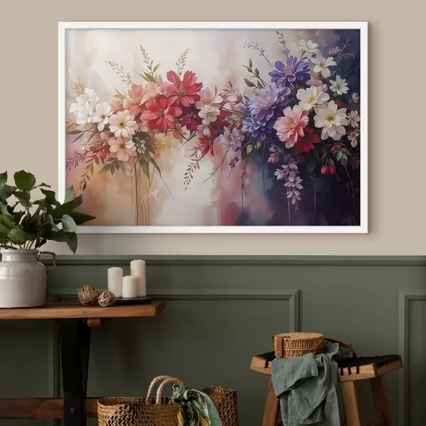 Poster Flores de colores como dalias rojas, rosas y moradas, margaritas y otras flores sobre un fondo suave y difuminado f42234