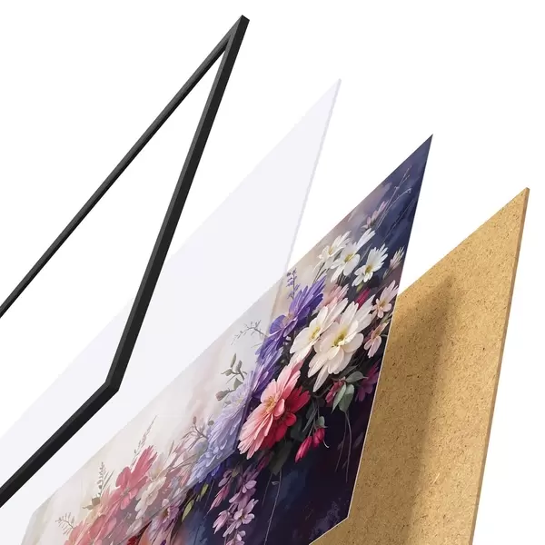 El póster consta de marco, plexiglás, imagen impresa y soporte de aglomerado. El póster puede colgarse inmediatamente en la pared gracias a los soportes de la parte posterior.
