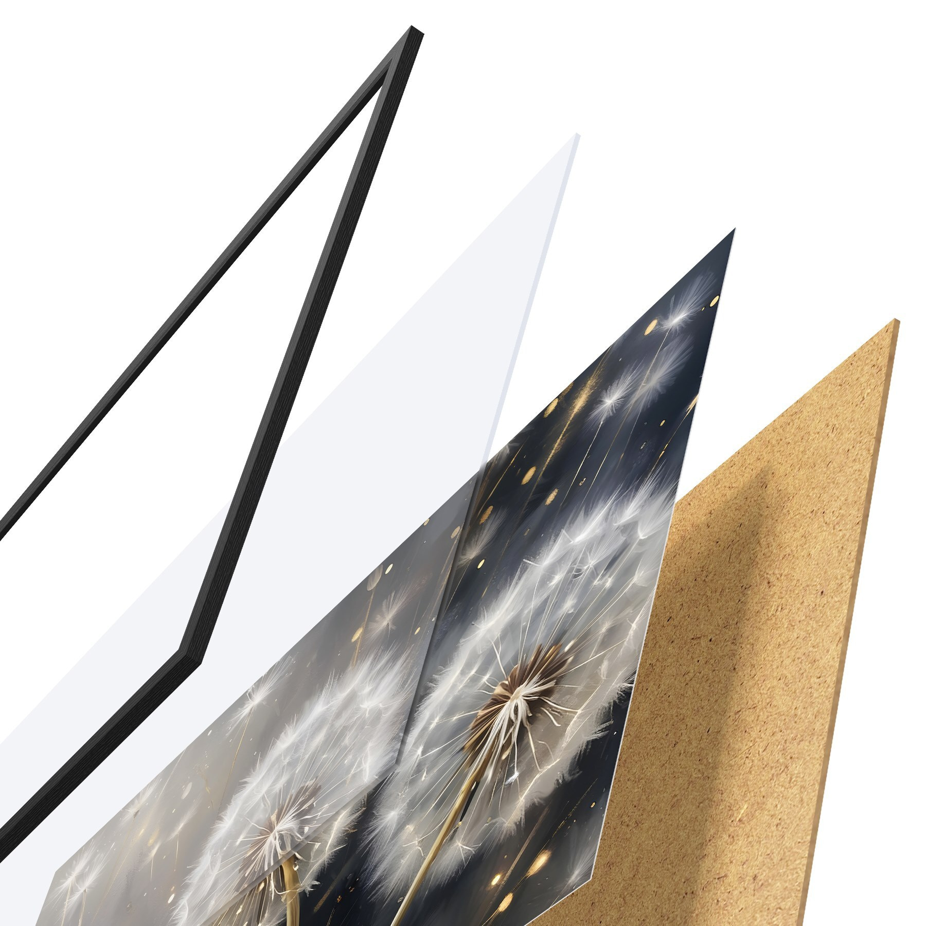 El póster consta de marco, plexiglás, imagen impresa y soporte de aglomerado. El póster puede colgarse inmediatamente en la pared gracias a los soportes de la parte posterior.