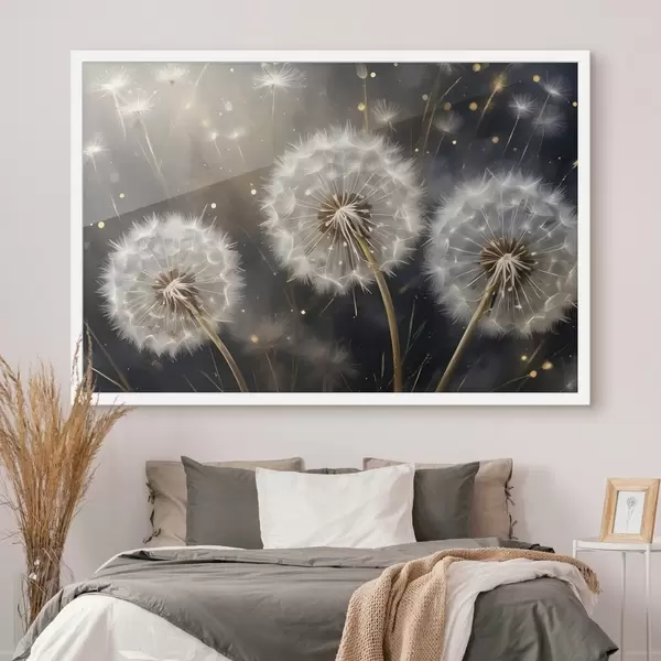 Poster Flores de diente de león con sus esponjosas cabezas de semillas blancas sobre un fondo oscuro, creando una atmósfera mágica f42235
