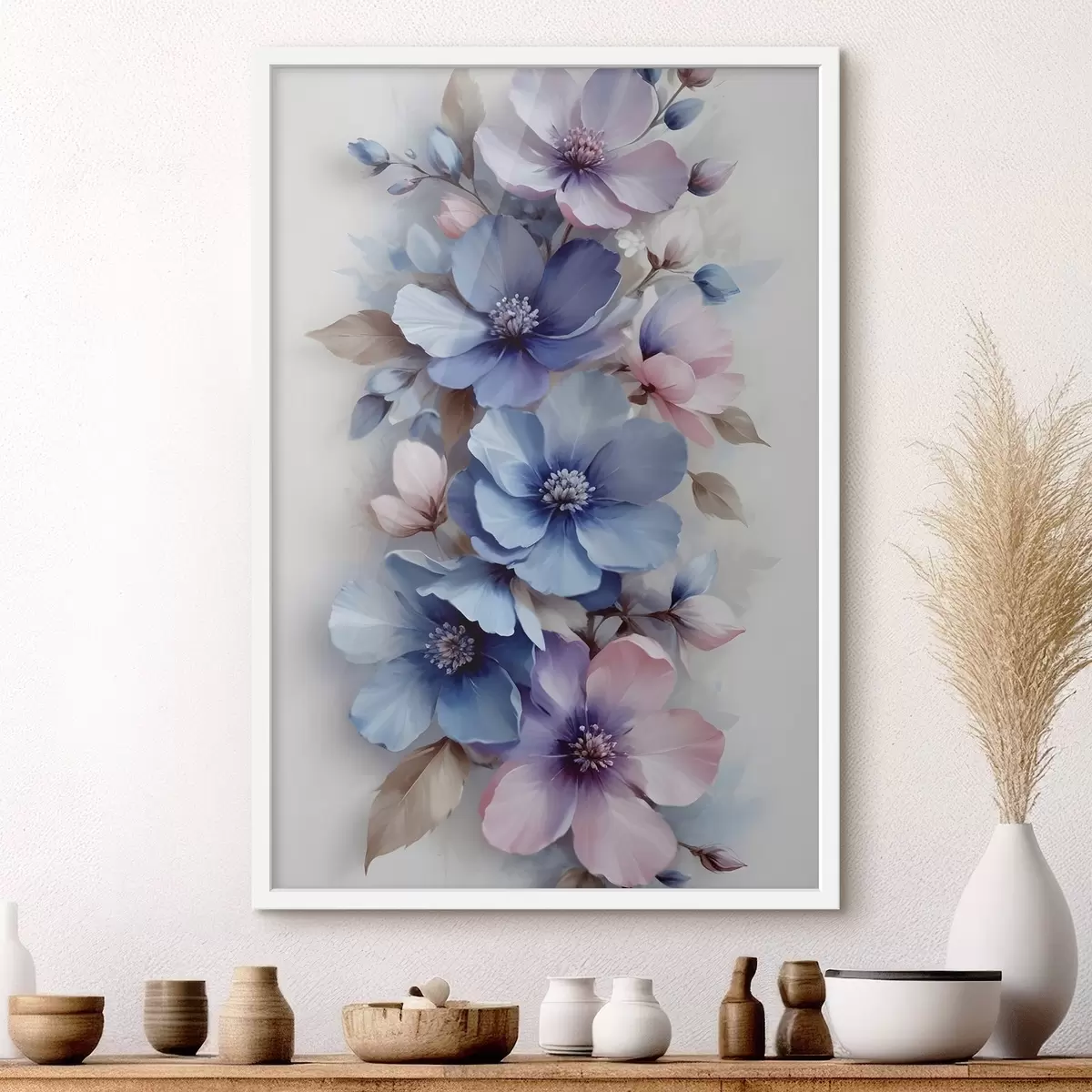 Poster Delicadas flores azules y rosas con suaves pétalos y centros, dispuestas en un bonito estampado floral sobre un fondo claro Nr f42241