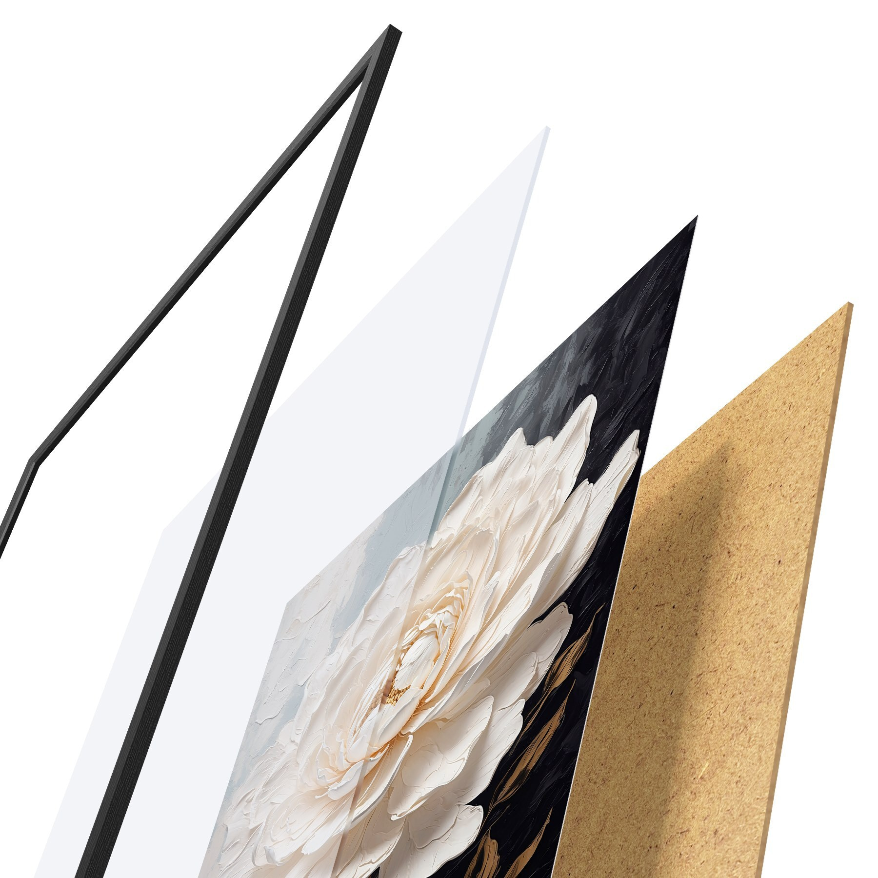 El póster consta de marco, plexiglás, imagen impresa y soporte de aglomerado. El póster puede colgarse inmediatamente en la pared gracias a los soportes de la parte posterior.