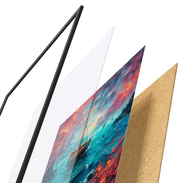 El póster consta de marco, plexiglás, imagen impresa y soporte de aglomerado. El póster puede colgarse inmediatamente en la pared gracias a los soportes de la parte posterior.