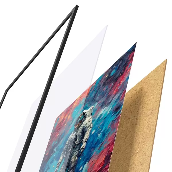 El póster consta de marco, plexiglás, imagen impresa y soporte de aglomerado. El póster puede colgarse inmediatamente en la pared gracias a los soportes de la parte posterior.