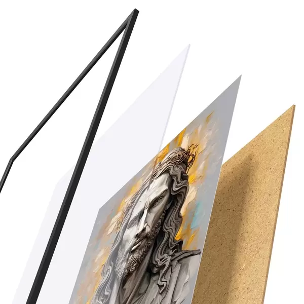 El póster consta de marco, plexiglás, imagen impresa y soporte de aglomerado. El póster puede colgarse inmediatamente en la pared gracias a los soportes de la parte posterior.