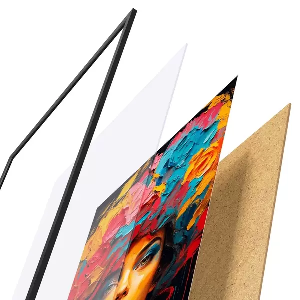 El póster consta de marco, plexiglás, imagen impresa y soporte de aglomerado. El póster puede colgarse inmediatamente en la pared gracias a los soportes de la parte posterior.