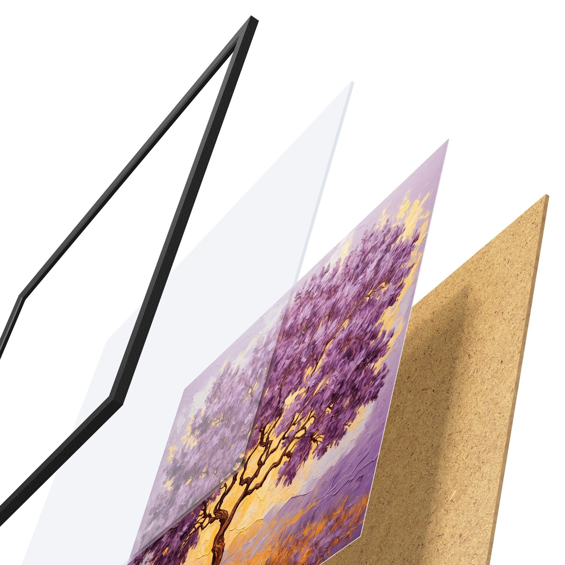 El póster consta de marco, plexiglás, imagen impresa y soporte de aglomerado. El póster puede colgarse inmediatamente en la pared gracias a los soportes de la parte posterior.