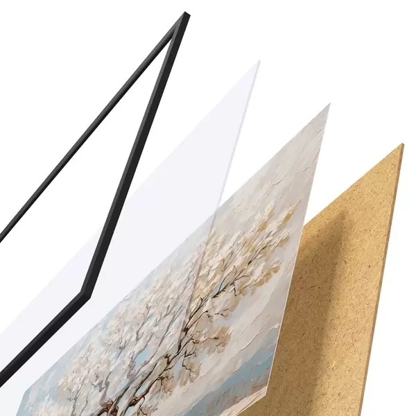El póster consta de marco, plexiglás, imagen impresa y soporte de aglomerado. El póster puede colgarse inmediatamente en la pared gracias a los soportes de la parte posterior.