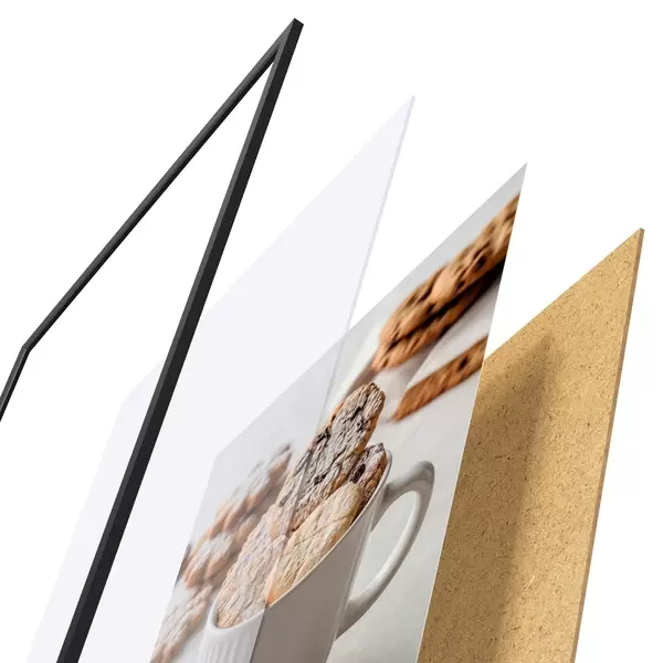 El póster consta de marco, plexiglás, imagen impresa y soporte de aglomerado. El póster puede colgarse inmediatamente en la pared gracias a los soportes de la parte posterior.