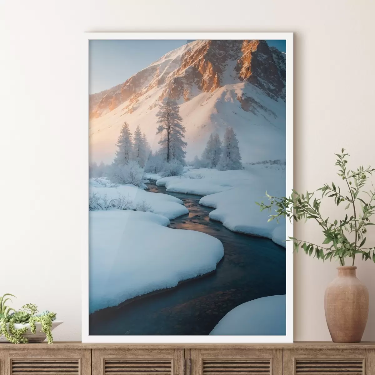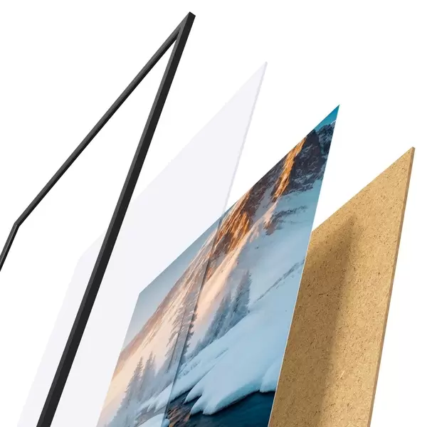 El póster consta de marco, plexiglás, imagen impresa y soporte de aglomerado. El póster puede colgarse inmediatamente en la pared gracias a los soportes de la parte posterior.