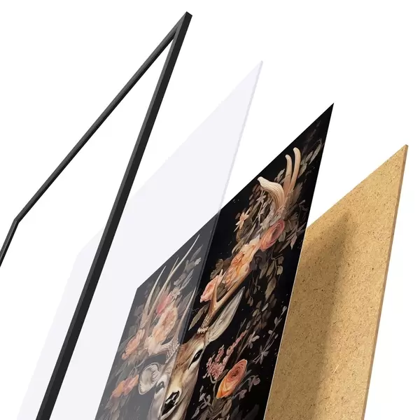 El póster consta de marco, plexiglás, imagen impresa y soporte de aglomerado. El póster puede colgarse inmediatamente en la pared gracias a los soportes de la parte posterior.
