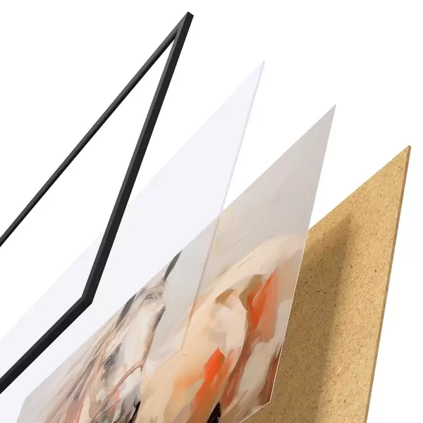 El póster consta de marco, plexiglás, imagen impresa y soporte de aglomerado. El póster puede colgarse inmediatamente en la pared gracias a los soportes de la parte posterior.