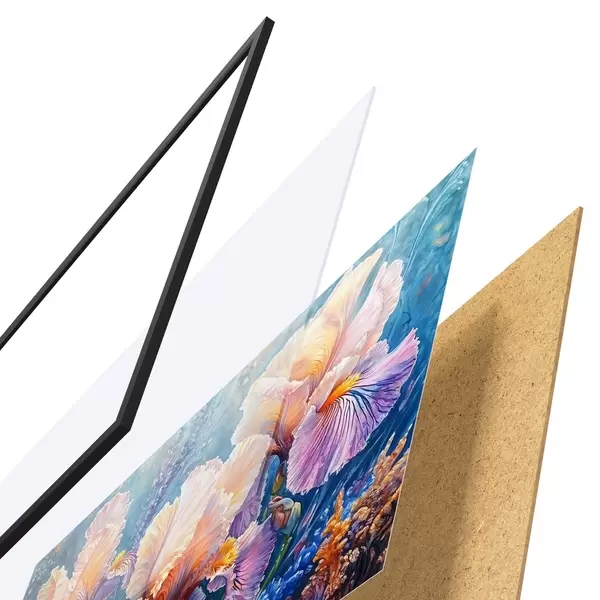 El póster consta de marco, plexiglás, imagen impresa y soporte de aglomerado. El póster puede colgarse inmediatamente en la pared gracias a los soportes de la parte posterior.
