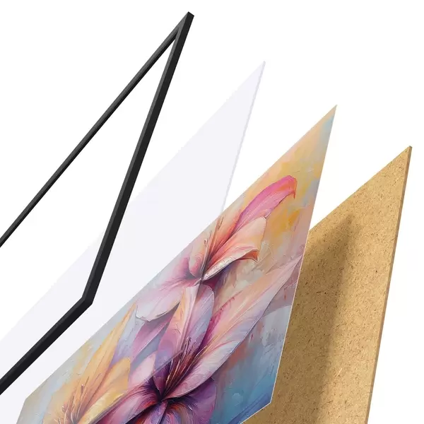 El póster consta de marco, plexiglás, imagen impresa y soporte de aglomerado. El póster puede colgarse inmediatamente en la pared gracias a los soportes de la parte posterior.