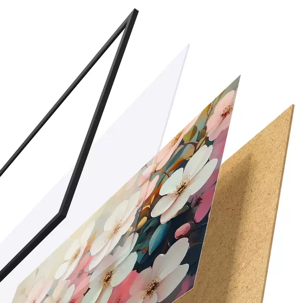 El póster consta de marco, plexiglás, imagen impresa y soporte de aglomerado. El póster puede colgarse inmediatamente en la pared gracias a los soportes de la parte posterior.