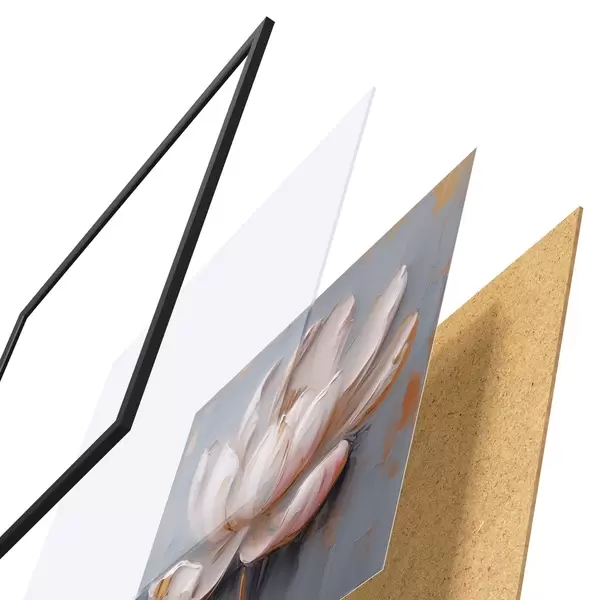 El póster consta de marco, plexiglás, imagen impresa y soporte de aglomerado. El póster puede colgarse inmediatamente en la pared gracias a los soportes de la parte posterior.