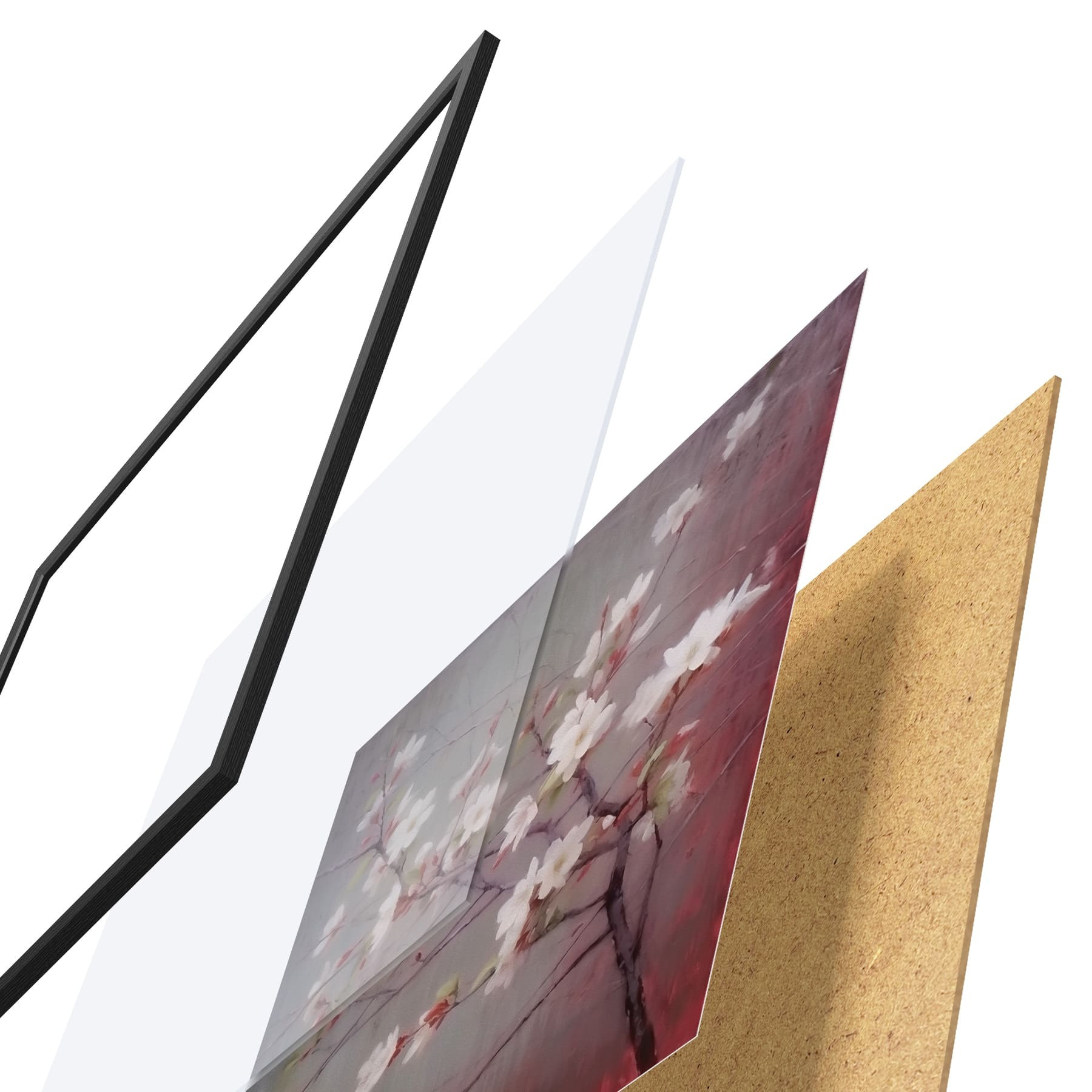 El póster consta de marco, plexiglás, imagen impresa y soporte de aglomerado. El póster puede colgarse inmediatamente en la pared gracias a los soportes de la parte posterior.