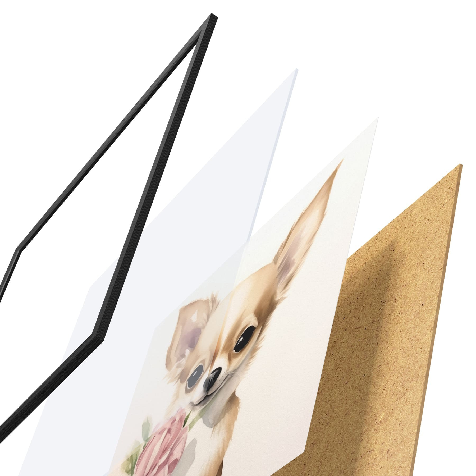 El póster consta de marco, plexiglás, imagen impresa y soporte de aglomerado. El póster puede colgarse inmediatamente en la pared gracias a los soportes de la parte posterior.