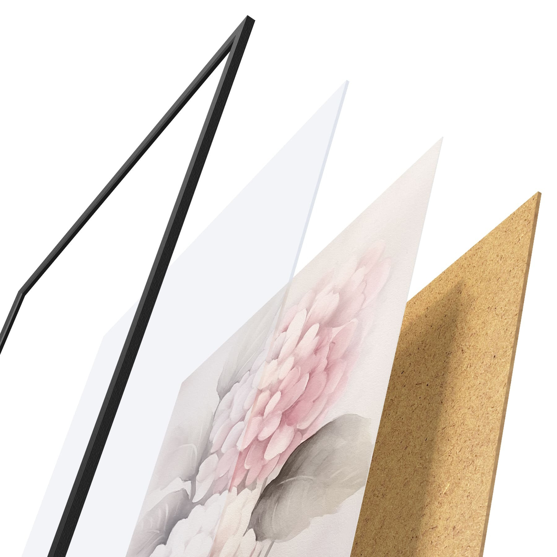 El póster consta de marco, plexiglás, imagen impresa y soporte de aglomerado. El póster puede colgarse inmediatamente en la pared gracias a los soportes de la parte posterior.