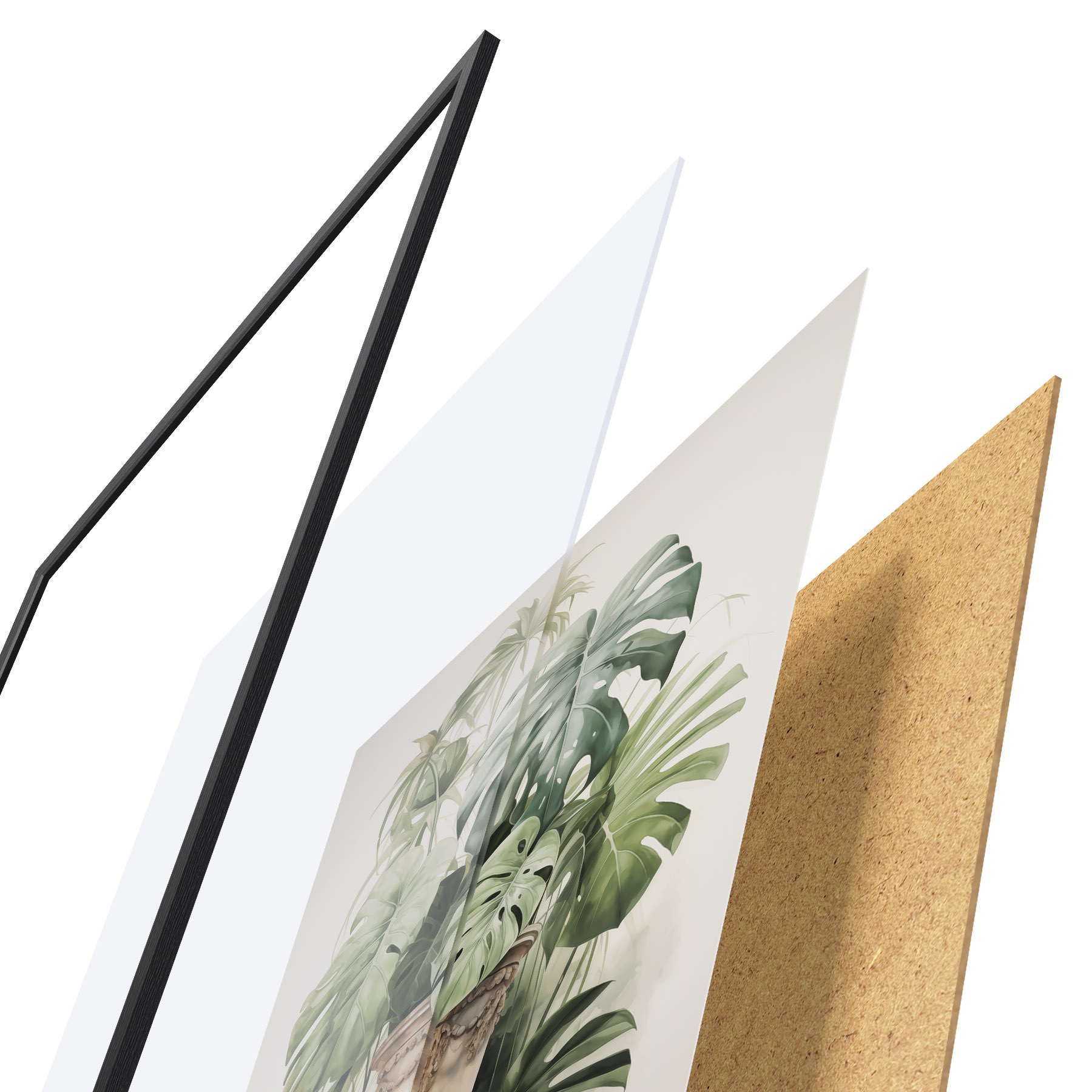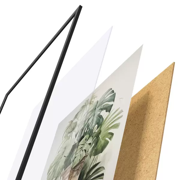 El póster consta de marco, plexiglás, imagen impresa y soporte de aglomerado. El póster puede colgarse inmediatamente en la pared gracias a los soportes de la parte posterior.