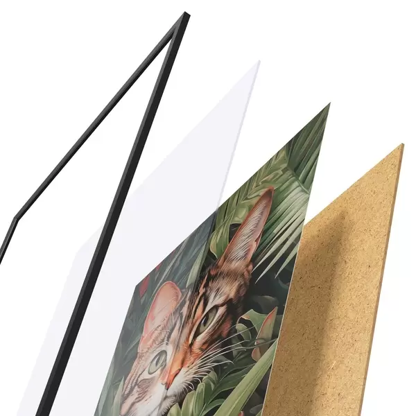 El póster consta de marco, plexiglás, imagen impresa y soporte de aglomerado. El póster puede colgarse inmediatamente en la pared gracias a los soportes de la parte posterior.