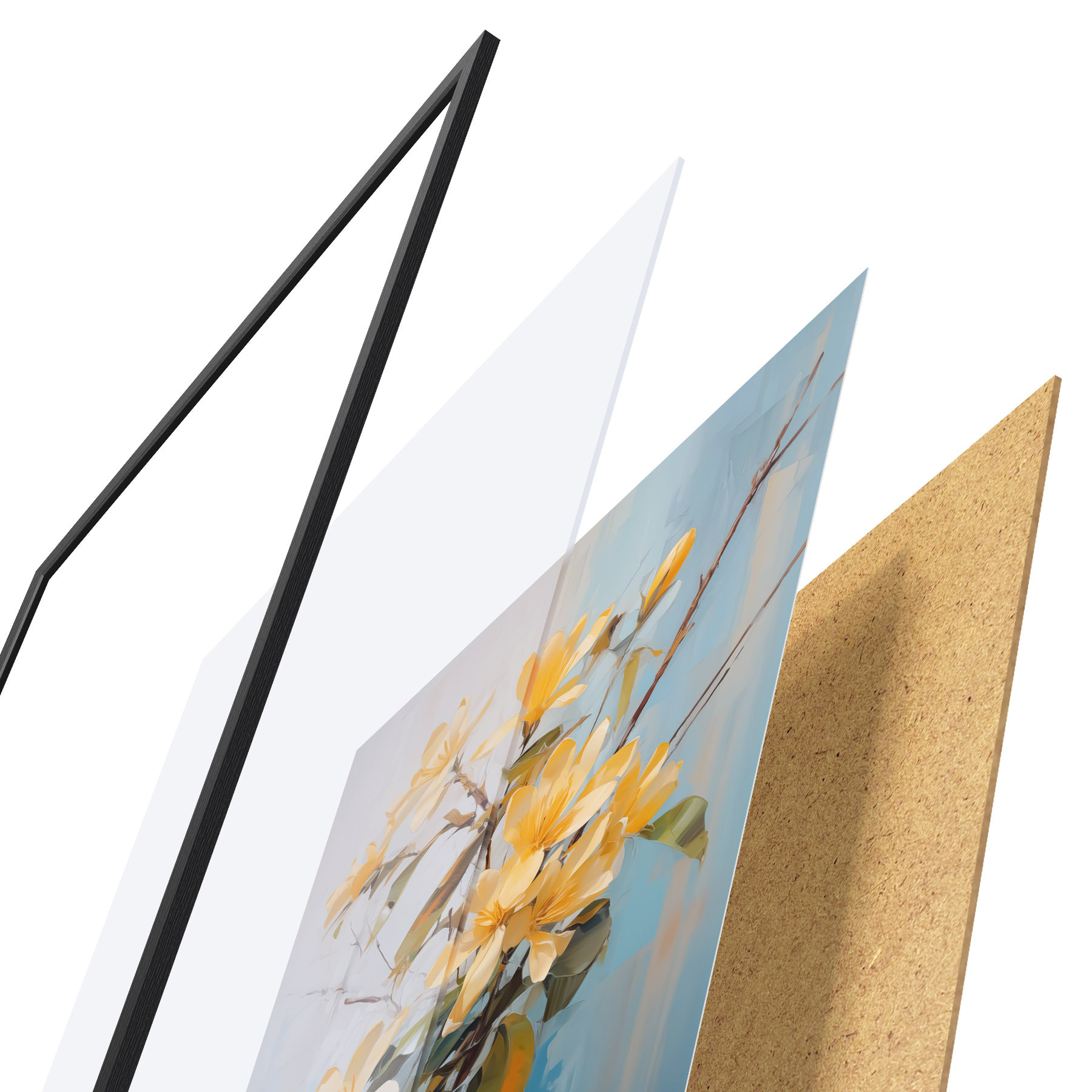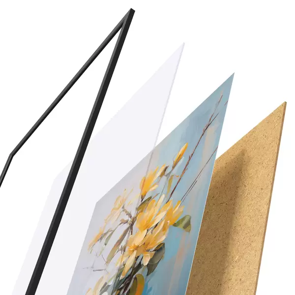 El póster consta de marco, plexiglás, imagen impresa y soporte de aglomerado. El póster puede colgarse inmediatamente en la pared gracias a los soportes de la parte posterior.