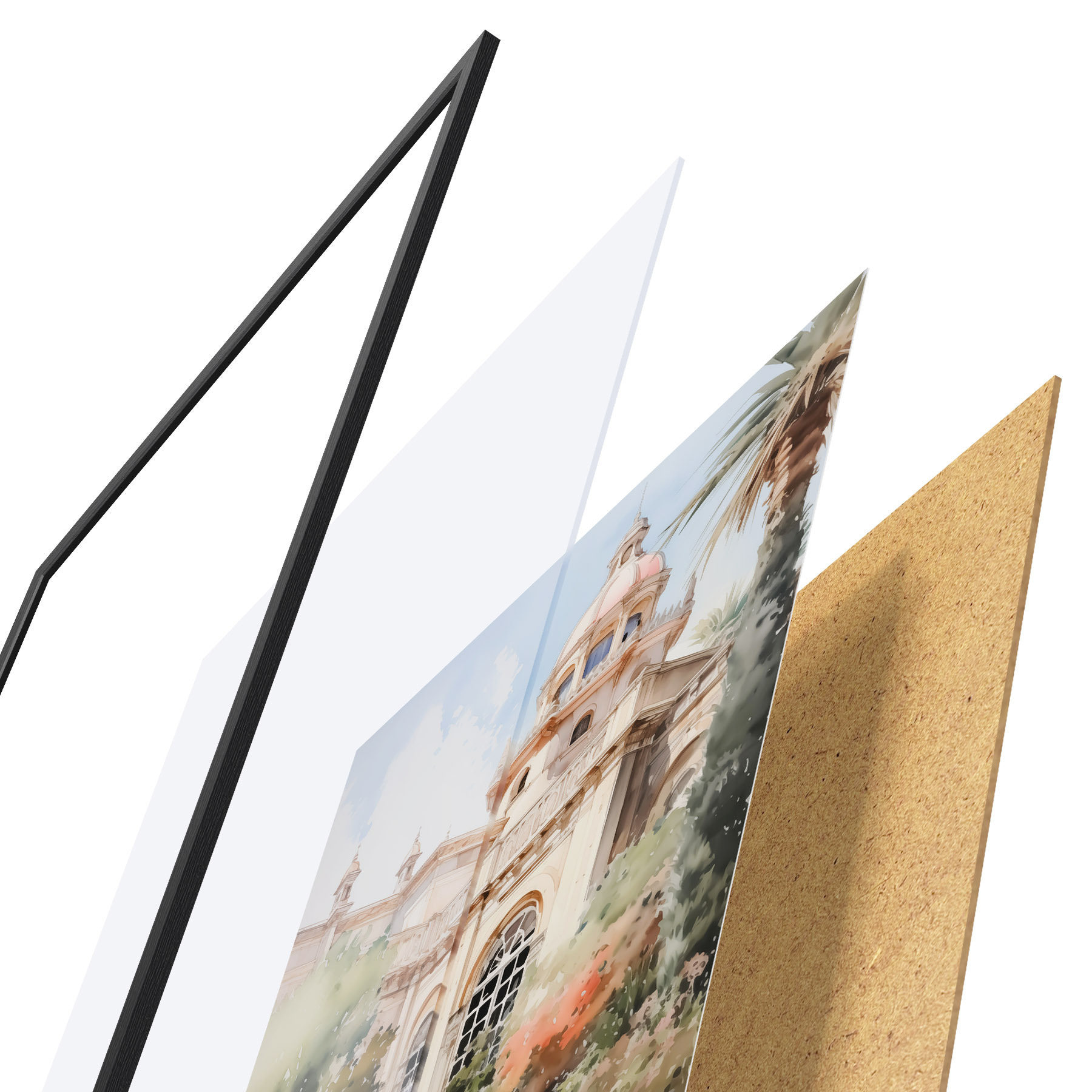 El póster consta de marco, plexiglás, imagen impresa y soporte de aglomerado. El póster puede colgarse inmediatamente en la pared gracias a los soportes de la parte posterior.