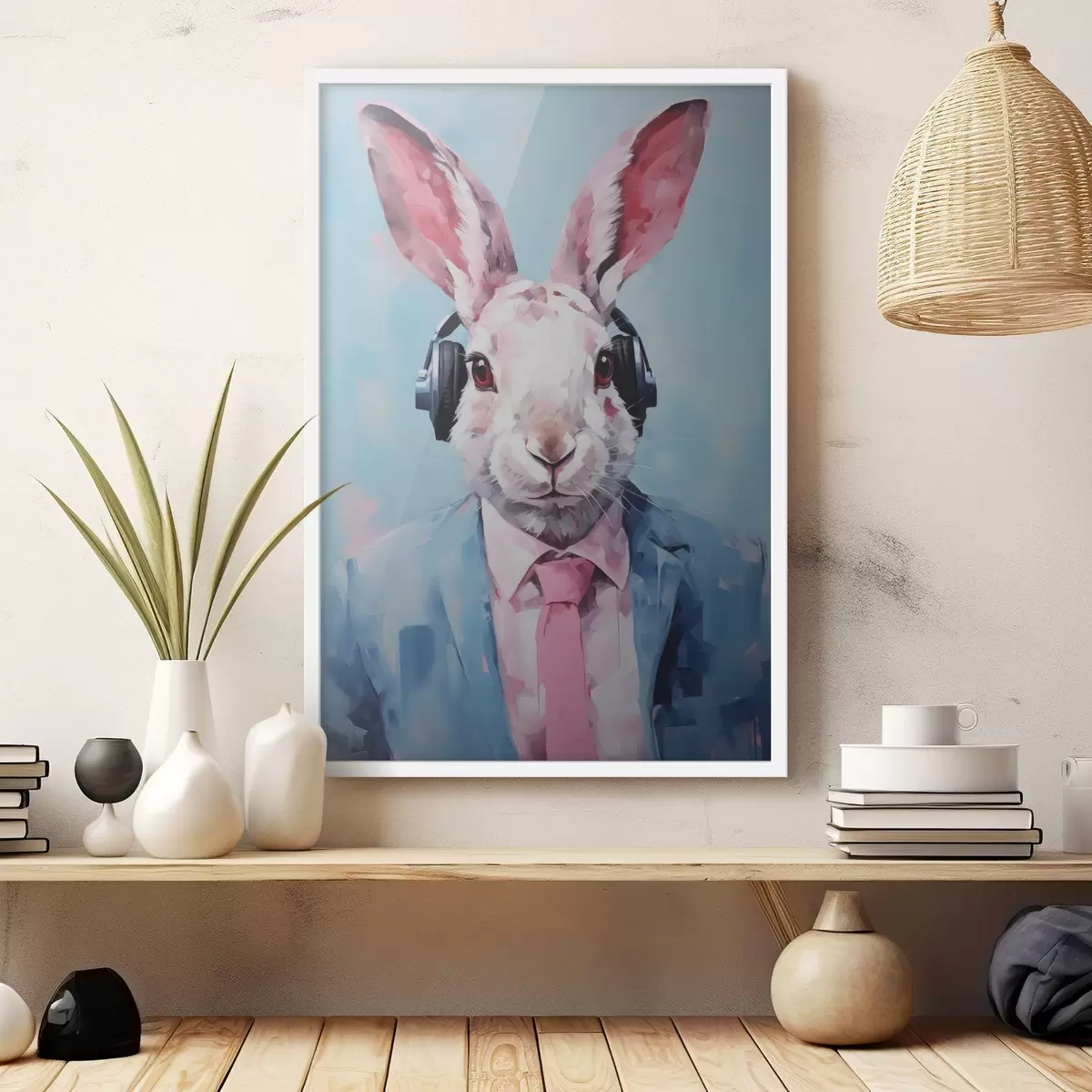Poster Conejo con auriculares en una chaqueta azul imitación de pintura Nr f42365