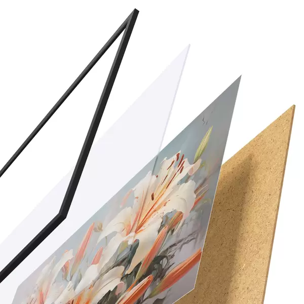 El póster consta de marco, plexiglás, imagen impresa y soporte de aglomerado. El póster puede colgarse inmediatamente en la pared gracias a los soportes de la parte posterior.