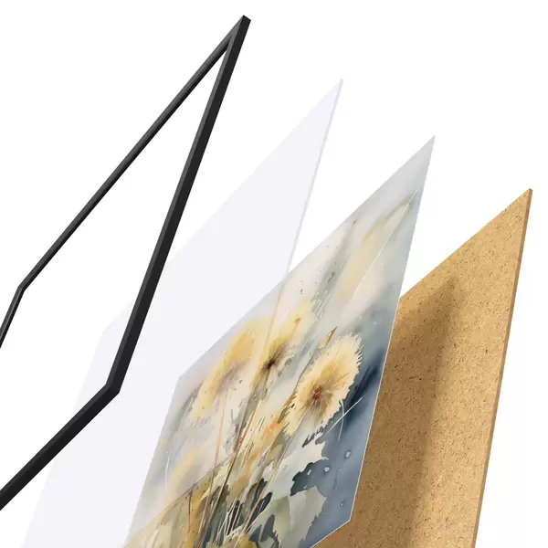 El póster consta de marco, plexiglás, imagen impresa y soporte de aglomerado. El póster puede colgarse inmediatamente en la pared gracias a los soportes de la parte posterior.