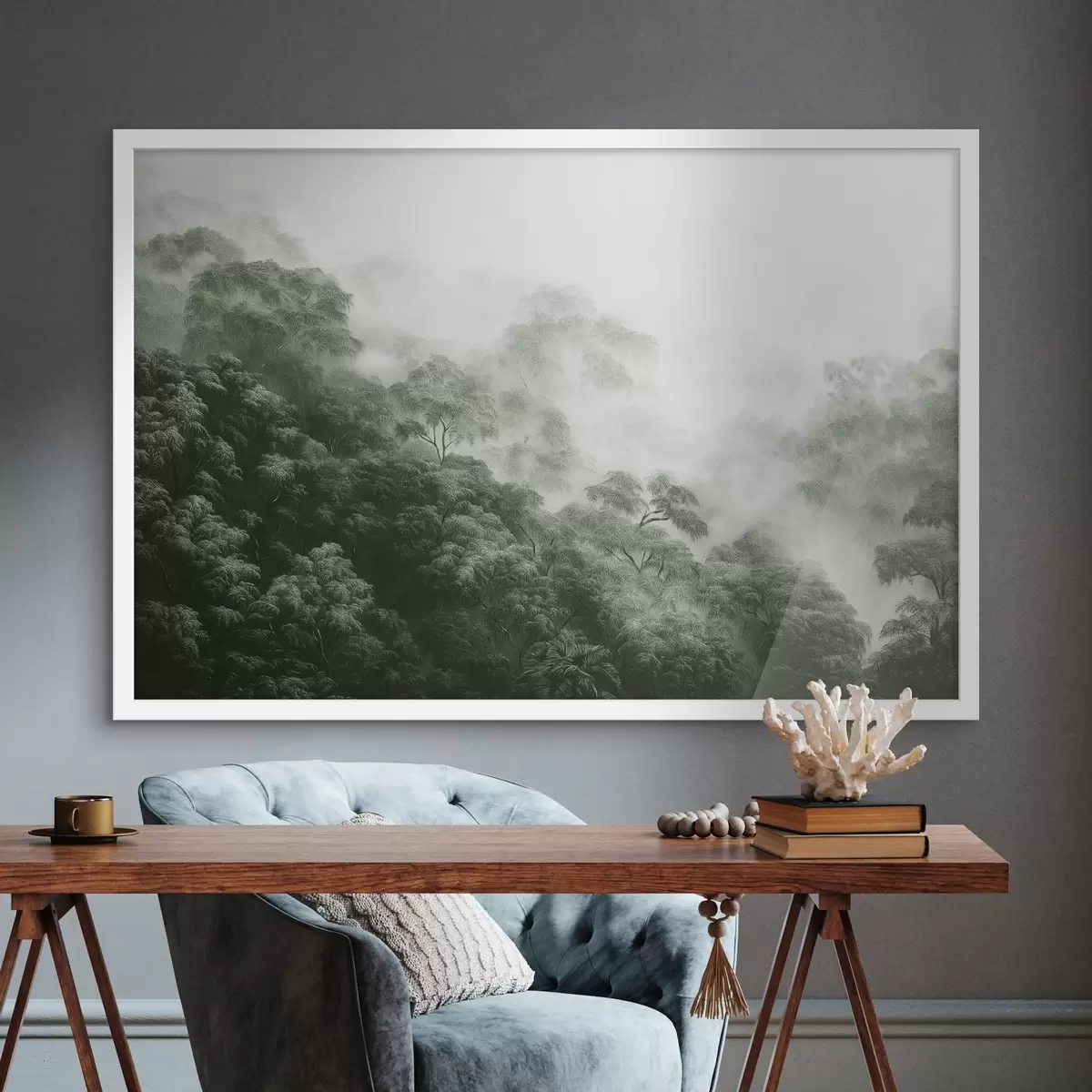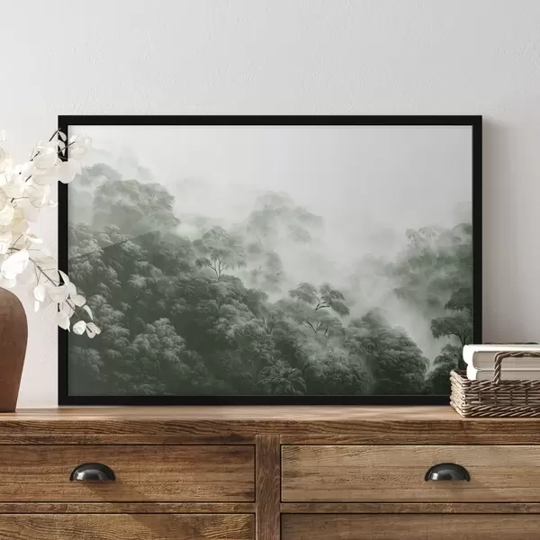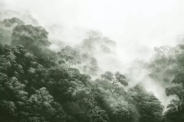 Poster Bosque tropical en la niebla, palmeras, colores verdes f42371