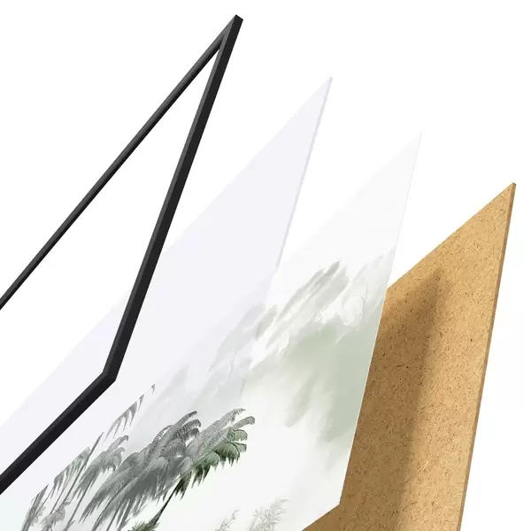 El póster consta de marco, plexiglás, imagen impresa y soporte de aglomerado. El póster puede colgarse inmediatamente en la pared gracias a los soportes de la parte posterior.