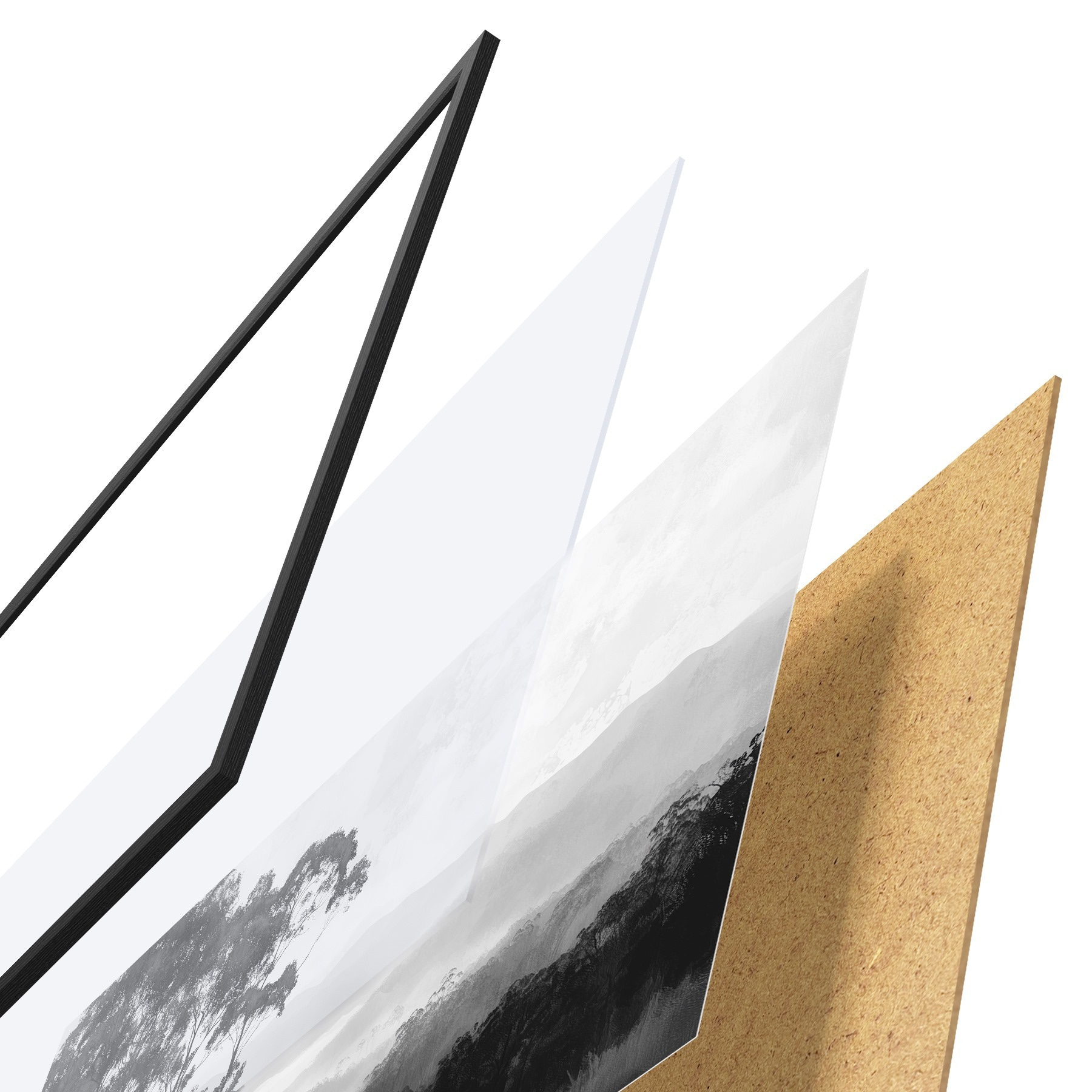El póster consta de marco, plexiglás, imagen impresa y soporte de aglomerado. El póster puede colgarse inmediatamente en la pared gracias a los soportes de la parte posterior.