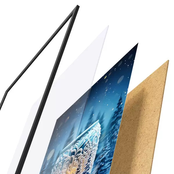 El póster consta de marco, plexiglás, imagen impresa y soporte de aglomerado. El póster puede colgarse inmediatamente en la pared gracias a los soportes de la parte posterior.