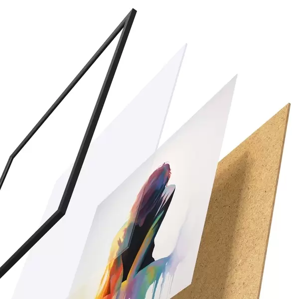 El póster consta de marco, plexiglás, imagen impresa y soporte de aglomerado. El póster puede colgarse inmediatamente en la pared gracias a los soportes de la parte posterior.