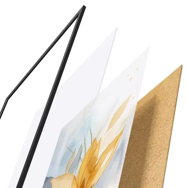 El póster consta de marco, plexiglás, imagen impresa y soporte de aglomerado. El póster puede colgarse inmediatamente en la pared gracias a los soportes de la parte posterior.