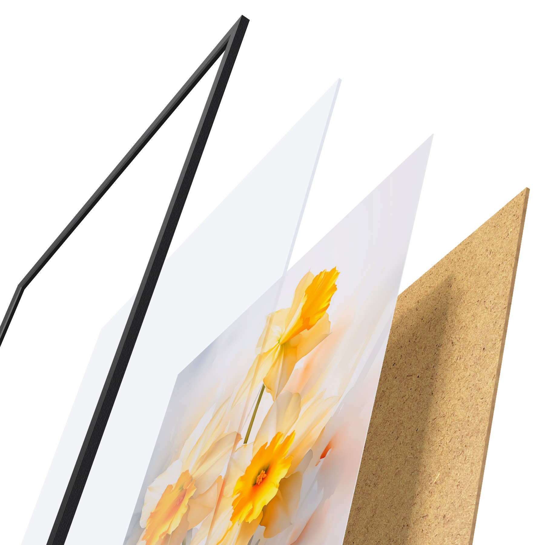 El póster consta de marco, plexiglás, imagen impresa y soporte de aglomerado. El póster puede colgarse inmediatamente en la pared gracias a los soportes de la parte posterior.