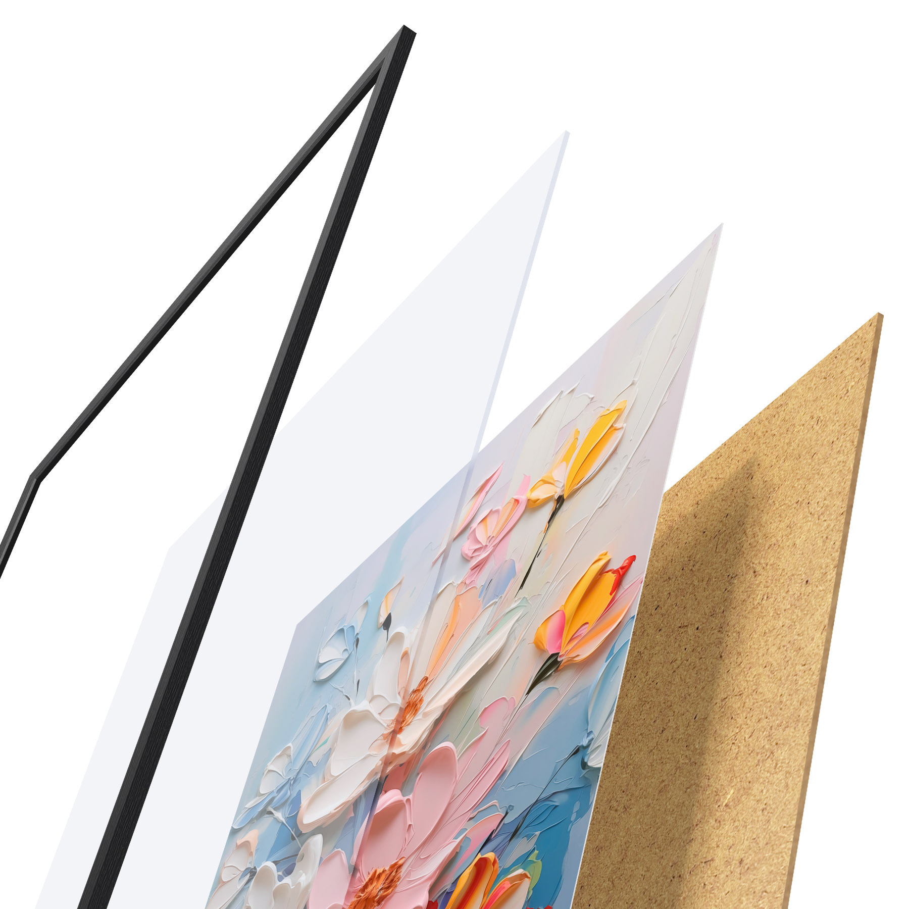 El póster consta de marco, plexiglás, imagen impresa y soporte de aglomerado. El póster puede colgarse inmediatamente en la pared gracias a los soportes de la parte posterior.