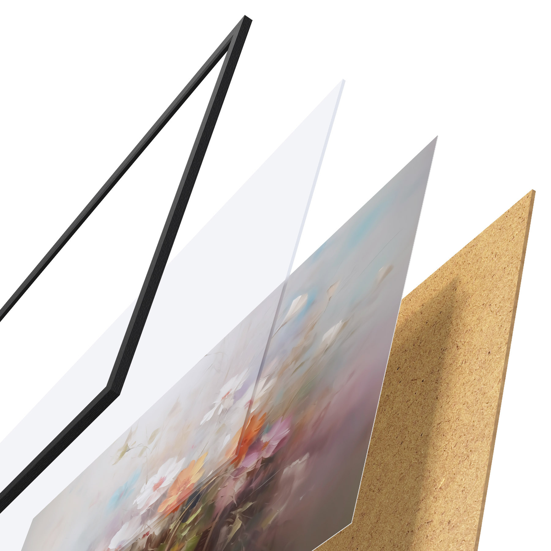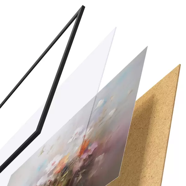 El póster consta de marco, plexiglás, imagen impresa y soporte de aglomerado. El póster puede colgarse inmediatamente en la pared gracias a los soportes de la parte posterior.