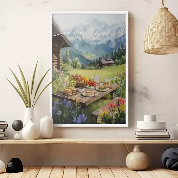 Poster Paisajes de montaña, pradera de verano, casas de madera, desayuno f42425