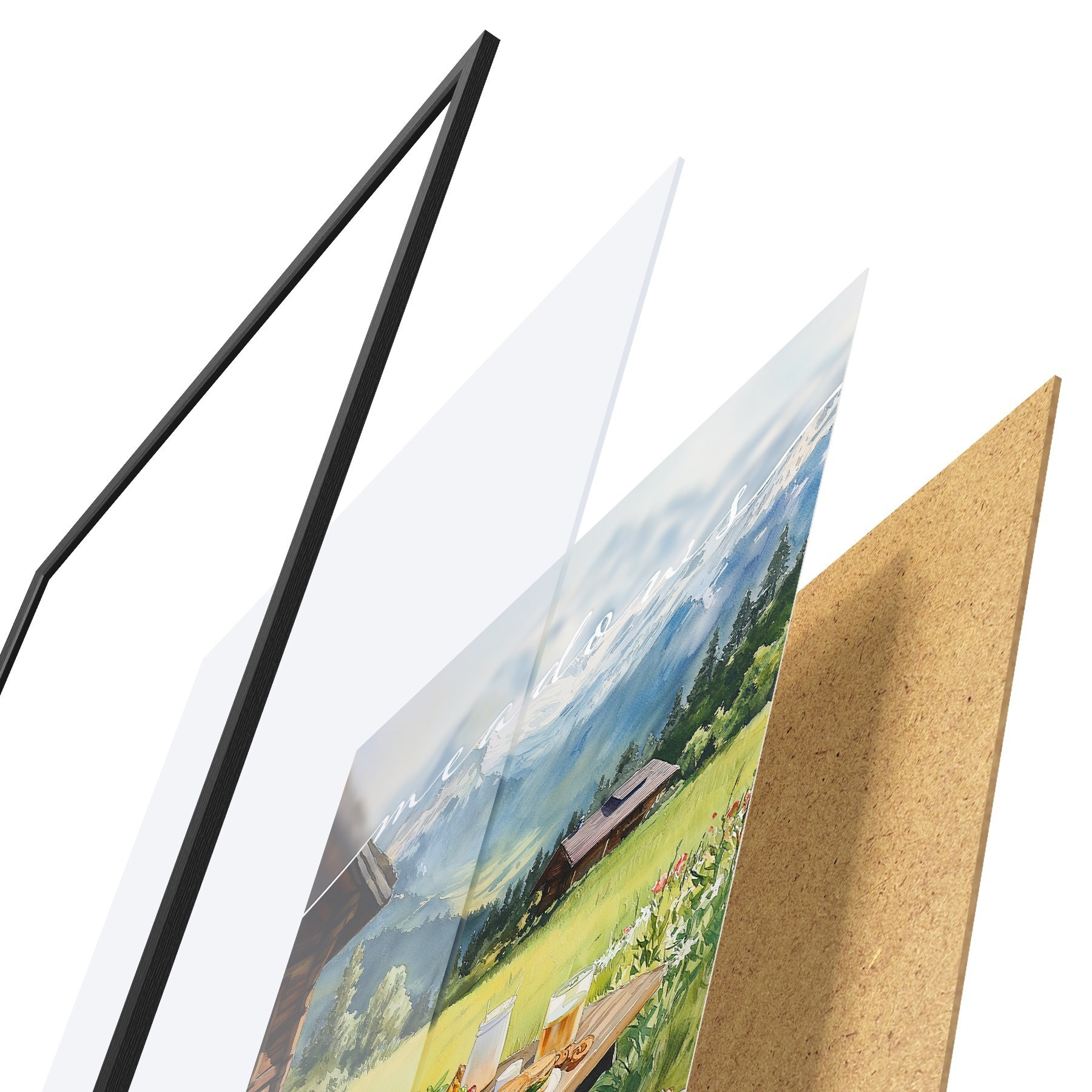 El póster consta de marco, plexiglás, imagen impresa y soporte de aglomerado. El póster puede colgarse inmediatamente en la pared gracias a los soportes de la parte posterior.