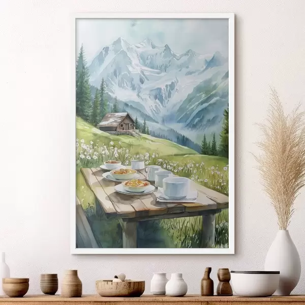 Poster Desayuno en los Alpes, montañas, bosque, naturaleza, verano, estilo acuarela Nr f42426